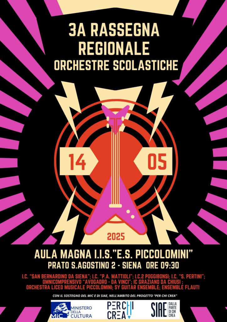 Quest’anno la nostra Aula Magna accoglierà sei istituti comprensivi della Provincia di Siena, le esibizioni dell’Orchestra e Coro del Liceo Musicale Piccolomini, dell’Ensemble di flauti e del SY Guitar Ensemble, esperienze, queste ultime, sostenute dal MiC e da Siae nell’ambito del programma “Per Chi Crea” edizione 2024 Bando 2 Settore Musica progetto “Il rumore delle Emozioni”.